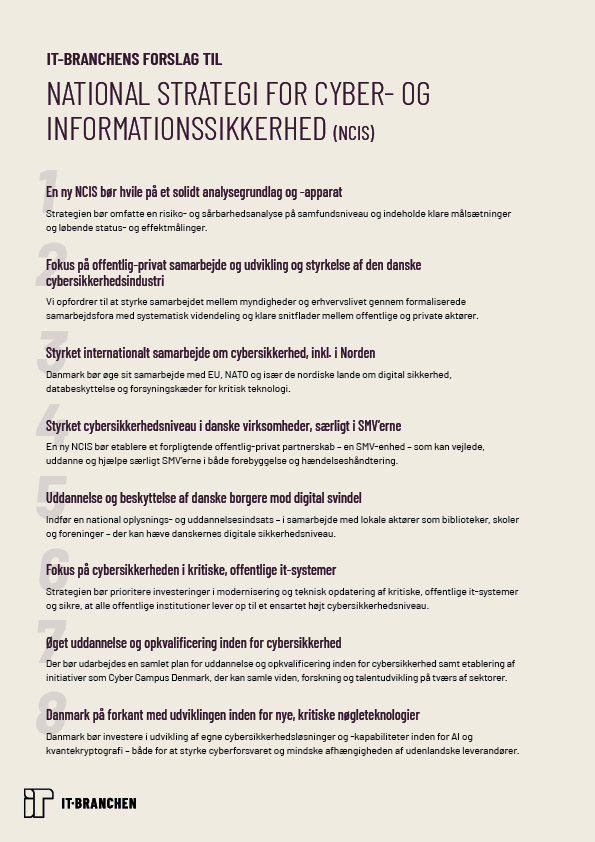 Med otte konkrete initiativforslag udarbejdet i regi af IT-Branchens Policy Board for Cybersikkerhed peger IT-Branchen på en række indsatsområder, som, vi mener, det er helt afgørende, den kommende NCIS adresserer. IT-Branchens initiativforslag vil i de kommende uger blive drøftet med relevante politikere, da vi ønsker at bidrage til, at den kommende NCIS bliver en handlekraftig strategi, der styrker Danmarks digitale sikkerhed, resiliens og suverænitet samt gør cybersikkerhed til en national styrkeposition.